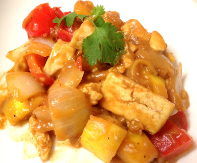 2. In another pan, heat the oil, add garlic, ginger and red chili flakes, add onion, bell pepper, mango and tofu. (In the same sequence, one after another).
